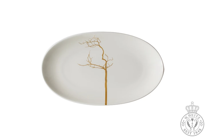 Der Schwarzwald diente bei diesem Dibbern Geschirr als Inspirationsquelle. Der in London lebende deutsche Produktdesigner Bodo Sperlein entwarf das Bone China Porzellan Golden Forest zusammen mit der Serie Black Forest. Zarte Baumsilhouetten in 24 Karat Goldveredelung zieren das filigrane Knochenporzellan und verwandeln Ihre Tafel in eine kleine Waldlandschaft. Das Dibbern Porzellan basiert auf der Grundform „Pure“ und ist spülmaschinengeeignet, jedoch nicht mikrowellenfest.Egal ob sie auf dieser Fine Bone China Beilage Gemüse, Käsehäppchen oder Petit Fours servieren, mit dem goldenen Baumdekor, in der Mitte des ovalen Tellers, machen all Ihre Speisen eine ausgezeichnete Figur.