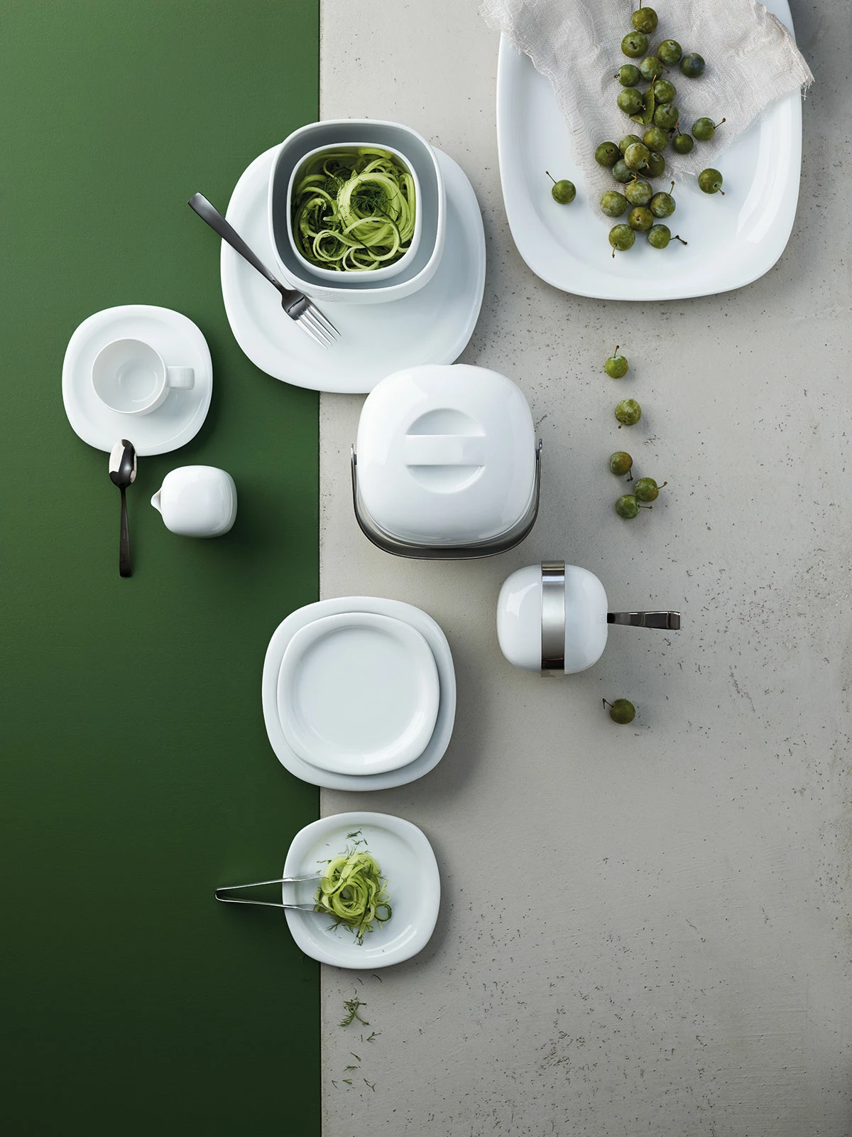 Die Geschirrserie Suomi weiß von Rosenthal ist der Inbegriff des skandinavischen Purismus. Mit sehr ausgewählten, vielfältig verwendbaren Geschirrteilen, die der Form von Flusssteinen nachempfunden sind, ist sie schnell zu einem der Bestseller der Rosenthal studio-line geworden. Wenn Sie also die eckig-runden, klassischen Teller, Tassen und Schüsseln mögen, dann sind Sie nicht alleine – Suomi ist im Laufe der Jahre mehrfach ausgezeichnet worden. Trotzdem ist diese Serie nicht zu „schick“, um pflegeleicht zu sein: Alle Teile sind spülmaschinenfest und die Teile ohne Stahlelemente sind außerdem mikrowellengeeignet.